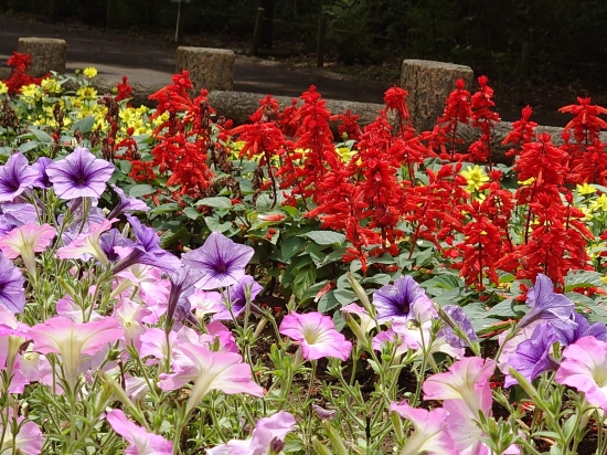 6月下旬、千葉市中央区の住宅街にある青葉の森公園です。園内をサイクリングしていると、眼の前の花壇がとても華やかでした。よく見ると花壇に、赤や黄色、そしてピンクや紫の花が植えられていました。