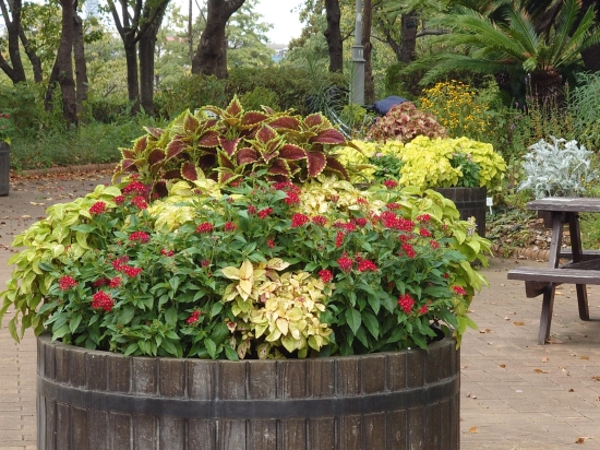 9月上旬、千葉市中央区にある青葉の森公園です。大きなフラワーポットに赤や黄色の花が植えられていて、花から秋が感じられます。
