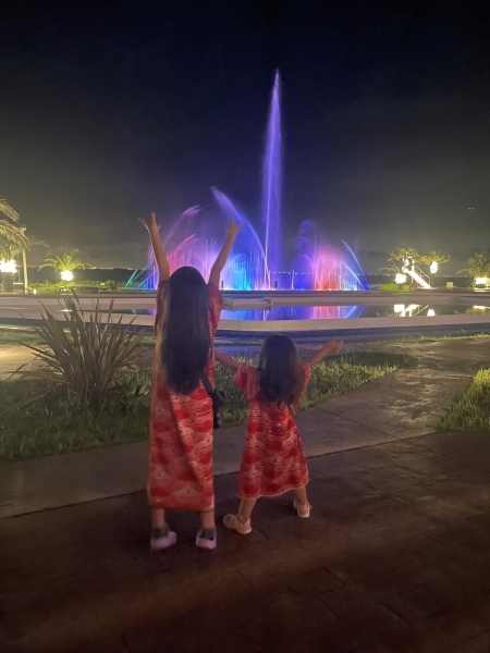 ホテル三日月富士見亭に宿泊した際の、夜の噴水ショーに子供達が大喜びでした!