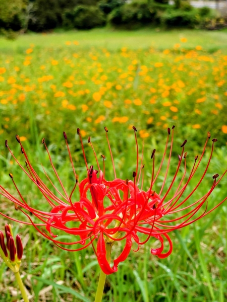 9月中旬、お彼岸前の曼珠沙華寺です。入り口前の彼岸花とキバナコスモスのツーショットを撮りました。赤とオレンジ、そして緑のコントラストが綺麗でした。