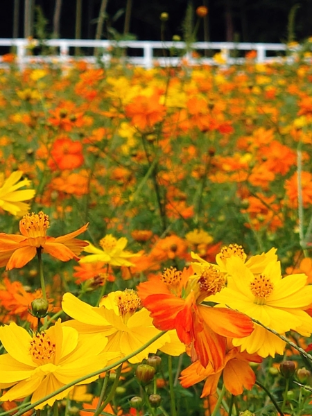 9月中旬、お彼岸前のさとにわ耕園です。向かいの畑にキバナコスモスが咲いていて綺麗でした。沢山のオレンジや黄色い花が眩しかったです。