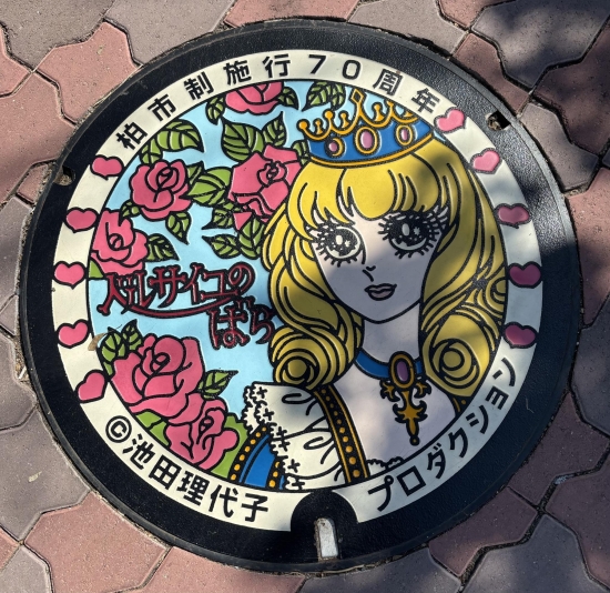 ベルサイユのバラのマリー・アントワネットが描かれたデザインマンホールです。 柏市制70周年を記念して設置されました。 ベルばらの作者、池田理代子先生が中学生の時に、お父様の転勤で柏市に引っ越してこられ、そして柏市在住の時代に『ベルサイユのばら』が描かれたご縁でのデザインだそうです。