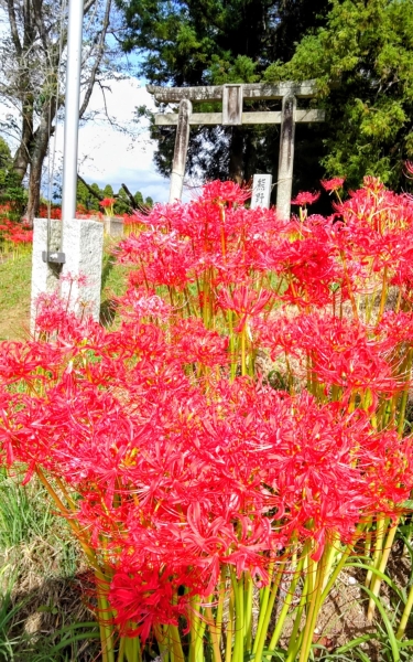 彼岸花で有名な市原市金剛地にある熊野神社に行って来ました。鳥居の前に咲いた赤い彼岸花が綺麗でした♡