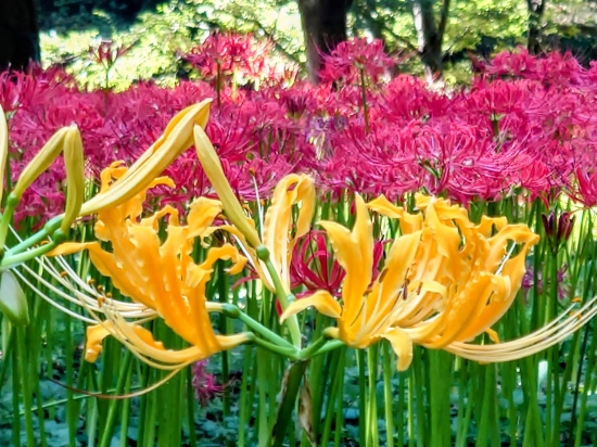 秋分の日の村上緑地公園です。普段余り見ることのない黄色い彼岸花と赤い彼岸花のツーショットです。黄・赤・緑のコントラストが綺麗でした。