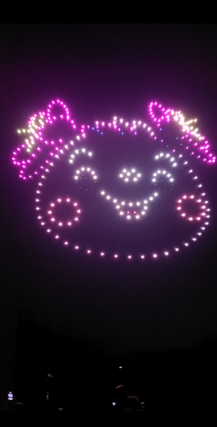 ドライブ中に屋台が沢山。思わず駐車したら、花火大会前に300機のドローンショーと。 圧巻でした。 この写真は、ドローンで作った「きみぴょん」