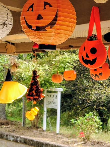 9月下旬の月崎駅です。屋根にハロウィンの飾り付けがされていたので、駅名板と一緒に撮りました。赤いのは彼岸花です。