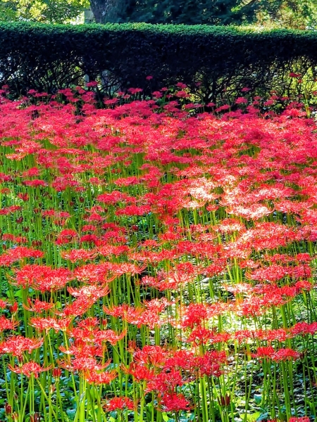 秋分の日の村上緑地公園です。赤い彼岸花と緑のコントラストが綺麗でした。