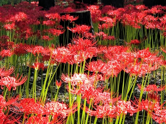 秋分の日の村上緑地公園です。朝陽を浴びて輝く沢山の赤い彼岸花と緑のコントラストが綺麗でした。