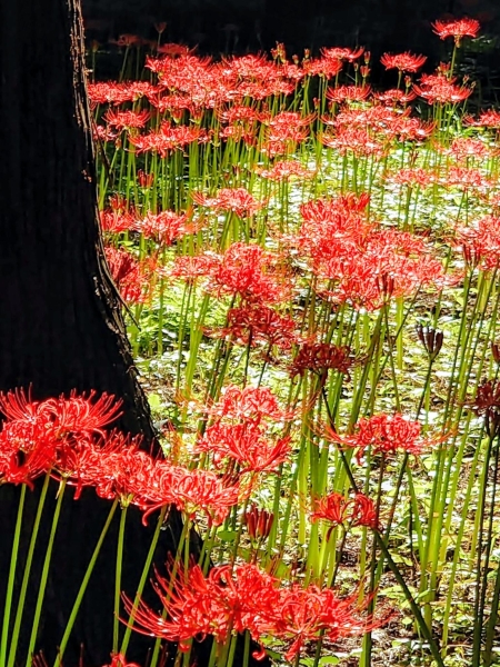 秋分の日の村上緑地公園です。朝陽を浴びて光り輝く赤い彼岸花とシルエットの木、そして緑のコントラストが綺麗でした。