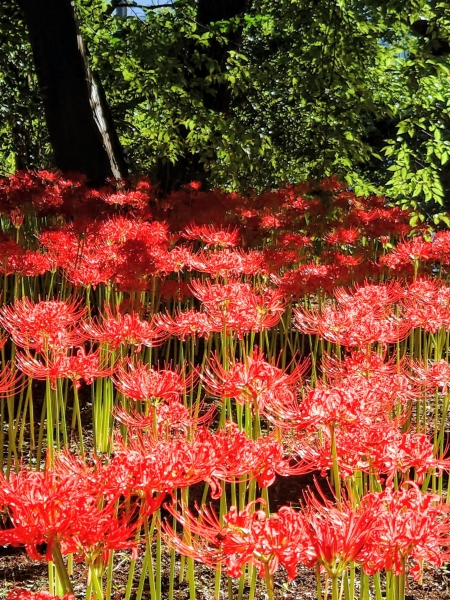 秋分の日の村上緑地公園です。朝陽を浴びて光り輝く沢山の赤い彼岸花が緑に映えて綺麗でした。