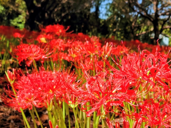 9月下旬の妙満寺です。本堂脇の彼岸花が見頃で綺麗でした。陽を浴びて光り輝く花は、まるで赤い絨毯のようでした。
