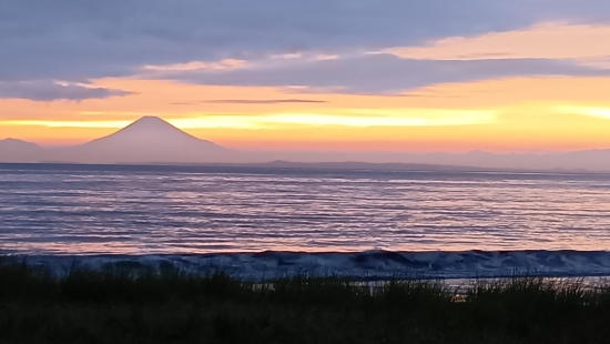 昼間は見えなかった富士山 網元の宿ろくやさんの貸切露天風呂のあと 夕飯前に海岸を散歩していたら 雲が晴れていってすてきな夕焼けが見られました。