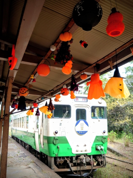 9月下旬の月崎駅です。屋根に吊るされたカラフルなハロウィン飾りと、ホームに入線する富士のヘッドマークが付いた急行キハ40のレアなツーショットです。