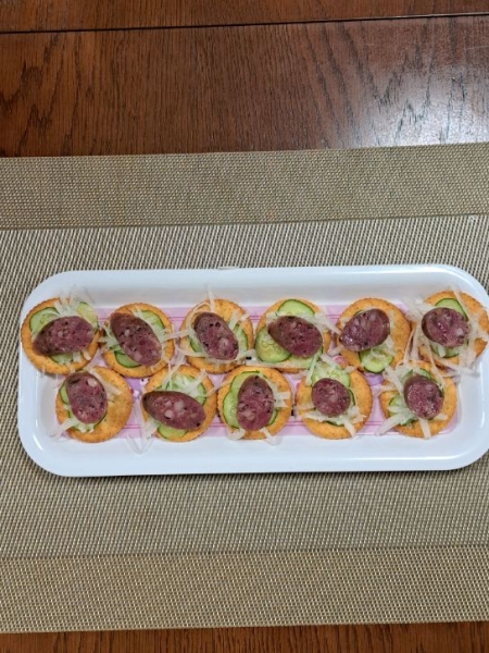 これは確か、KURKKFIELDSのチョリソーかな?チョリソーを薄切りにしてクラッカーに乗せたオードブルです。チョリソー、この頃は何か分かりませんでしたが、今はチョリソーめっちゃはまっています!!