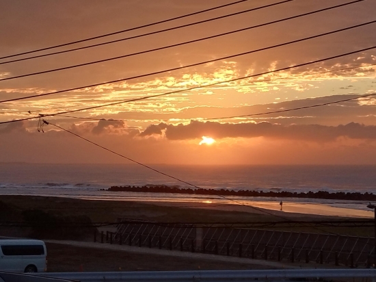 旭市磯なぎ荘で眺めた朝日です。まだ日が昇る前から、サーファーの皆さんが集まっておられました。