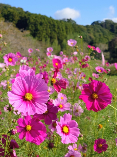 10月中旬の武田川コスモスロードです。濃淡のピンクのコスモスが緑と青空に映えて綺麗でした。