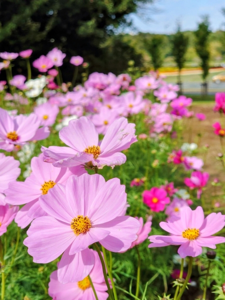 10月下旬の東京ドイツ村です。紅葉したコキアを見に来ましたが、コスモスが沢山咲いていました。淡いピンクの花が緑と青空に映えて綺麗でした。