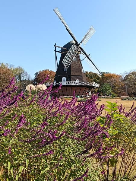 秋の澄んだ青空の下、ふなばしアンデルセン公園を散策しました。南ゲートを入るとすぐに風車があり、秋に咲くお花とともに記念の一枚を撮りました!