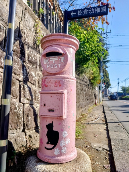麻賀多神社の近くにピンクのポストがありました!ポストには可愛い黒い猫が描かれていました♡