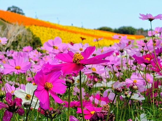 10月下旬の東京ドイツ村です。ピンクのコスモスと奥のオレンジと黄色のマリーゴールドのツーショットです。