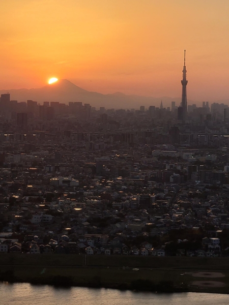 11月上旬の市川アイリンクタウン展望施設です。富士山に沈む夕日が撮れました!(残念ながらダイヤモンド富士ではありません)手前は江戸川です。