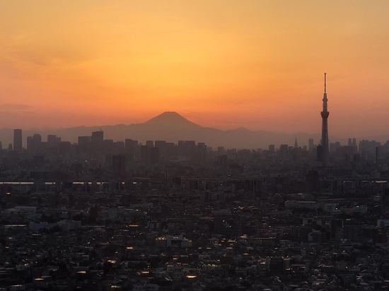 11月上旬の市川アイリンクタウン展望施設です。太陽が沈みオレンジの夕焼けに富士山のシルエットが浮かび上がりました。右はスカイツリーです。