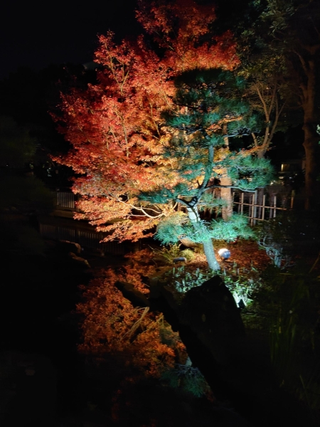 11月中旬の美浜園です。紅葉したモミジがライトアップされ幻想的でした。池に映り込む、さかさもみじも見れました!