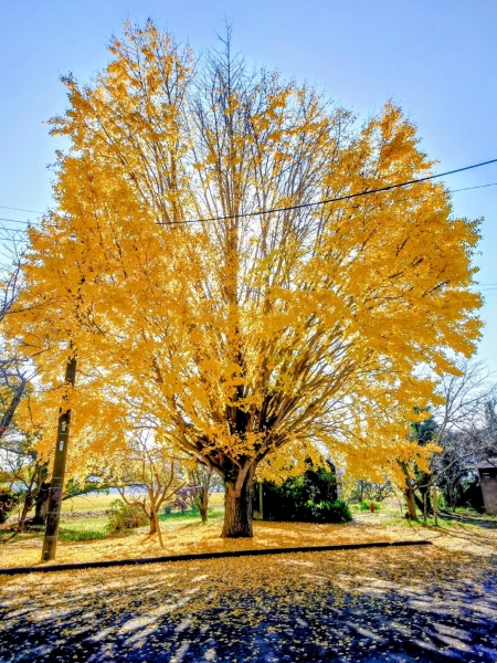 11月下旬の上総鶴舞駅です。駅前の黄葉した大イチョウが朝陽を浴びて輝いて綺麗でした。