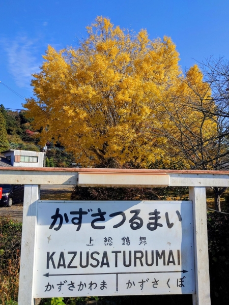 11月下旬の上総鶴舞駅です。駅名看板の後ろに大イチョウが見えたので一緒に撮りました。白い看板と黄色いイチョウ、そして青空のコントラストが綺麗でした。