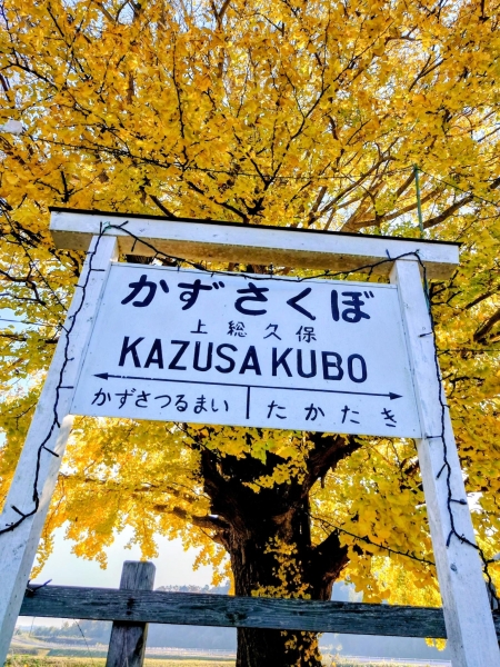 11月下旬の上総久保駅です。駅名看板とイチョウを下から撮りました。白い看板と黄色いイチョウのコントラストが綺麗でした。