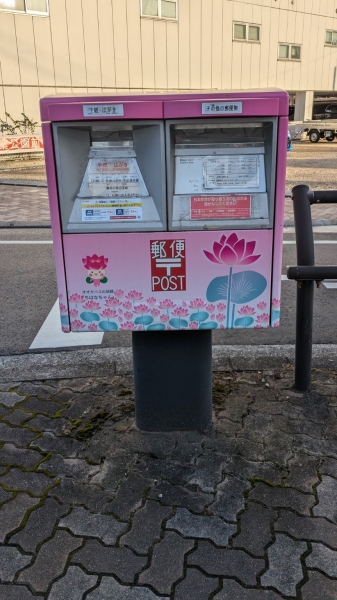 千葉公園のすぐ近くにある蓮の花とちはなちゃんのピンクの郵便ポストです☆ちはなちゃん、かわいい(^^♪蓮の花のピンク、蓮の葉の緑も色鮮やか!!