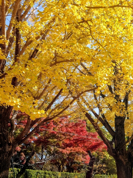 11月中旬の佐倉城址公園です。黄色く色付いたイチョウの黄葉が見事でした。奥に赤く紅葉したモミジも見えます。