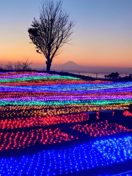 11月下旬のマザー牧場です。日の入り後、東京湾越しに富士山が浮かび上がりました。イルミネーションと夕空の富士山のシルエットが綺麗でした。