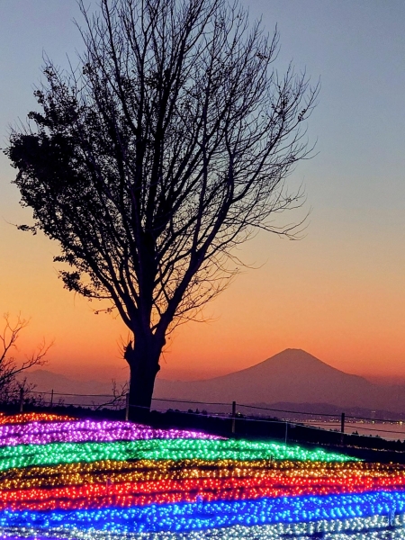 11月下旬のマザー牧場です。日の入り後、東京湾越しにくっきりと富士山が浮かび上がりました。青、赤、緑等のストライプのイルミネーションが、オレンジに染まる富士山のシルエットに映えて綺麗でした。