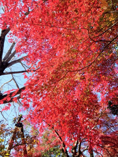 11月下旬、今は廃校になっている旧白鳥小学校です。入り口前の赤やオレンジ色のモミジが紅葉して綺麗でした。