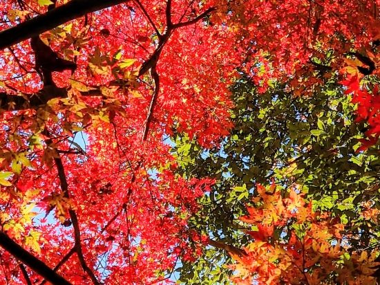 11月下旬の旧白鳥小学校です。門前の頭上の赤やオレンジのモミジ、そして緑の葉のコントラストが綺麗だったのでアップで撮りました。