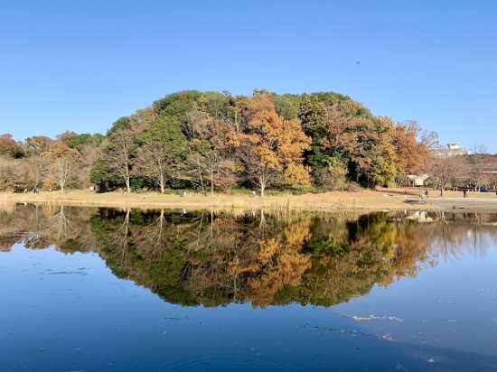 真っ青な空と色付いた木々が、水面に映り鏡のようです。