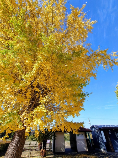 11月下旬、久留里線の平山駅です。駅前の黄葉した大きなイチョウが青空に映えて綺麗でした。