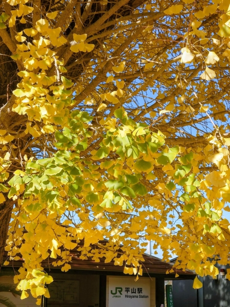 11月下旬、久留里線の平山駅です。駅前の黄葉した大きなイチョウが陽を受けて綺麗だったので、駅名板を入れて撮りました。