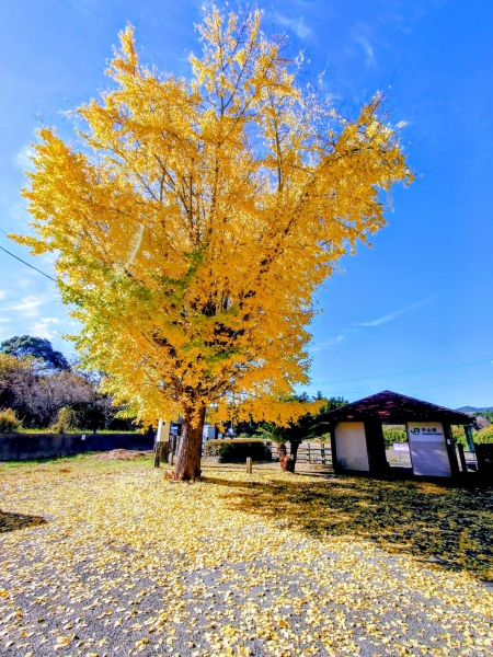 11月下旬、久留里線の平山駅です。駅前の大きなイチョウが黄葉して綺麗でした。黄色いイチョウの葉が澄みわたった青空に映えます。