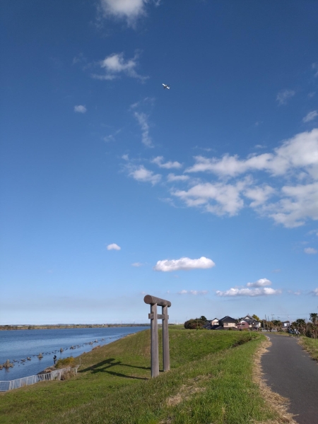 川の駅水の郷さわらからサイクリングで行ってきました。 香取神宮一の鳥居です。 成田空港から飛び立った飛行機を一緒に撮ることができました。