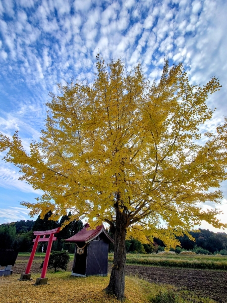 11月中旬、いすみ鉄道の人気スポット銀杏と祠です。黄色く黄葉したイチョウと赤い小さな祠と鳥居が、秋の青空と白い雲に映えます。