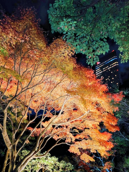 11月下旬の美浜園です。ライトアップされ暗闇に浮かび上がった赤く紅葉したモミジと緑のコントラストが綺麗でした。奥の建物はアパホテルです。