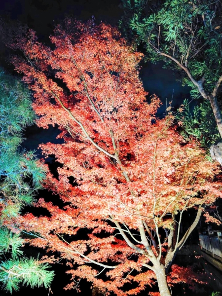 11月下旬の美浜園です。ライトアップされ、暗闇に浮かび上がる赤く紅葉したモミジと緑のコントラストが綺麗でした。