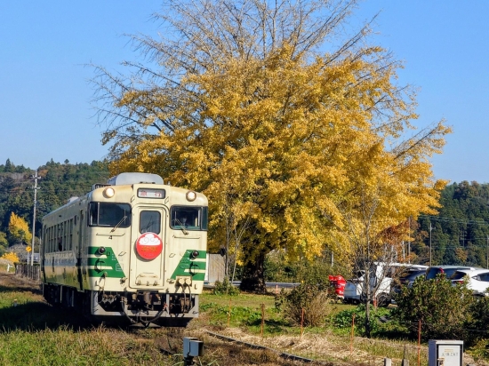11月下旬の上総久保駅です。駅を出発した急行キハ40男鹿色と黄葉したイチョウのツーショットです。急行には赤い出雲のヘッドマークが付いていました。