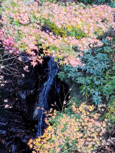12月上旬のもみじロードです。全体的に紅葉は見頃を過ぎていましたが、地蔵堂の滝は見頃で綺麗でした。白い滝とオレンジ色のモミジのアップです。