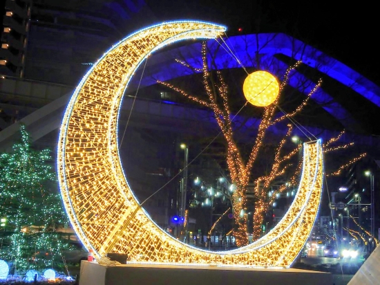 12月中旬の千葉中央公園です。ルミラージユちばの黄色い三日月のイルミネーションが青くライトアップされたセントラルアーチに映えて綺麗でした。