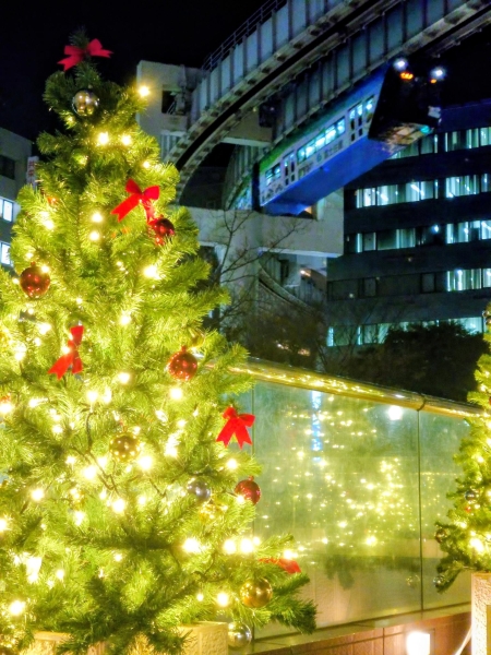 12月中旬の千葉そごうです。イルミネーションされたクリスマスツリーが綺麗だったので、モノレールの通過を待ってアップで撮りました。