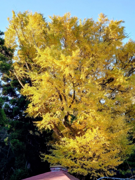 11月下旬の鹿野山神野寺です。本殿横の黄葉した大きなイチョウが午後の陽を受けて輝いて綺麗でした。