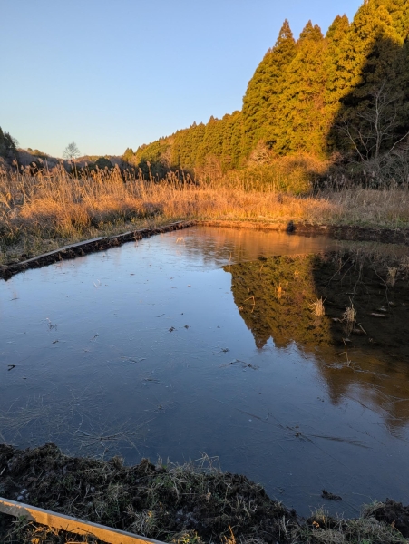 夕日に照らされた木々がオレンジで綺麗です。田んぼに映るのもいい感じ。寒いので田んぼは半分氷です。